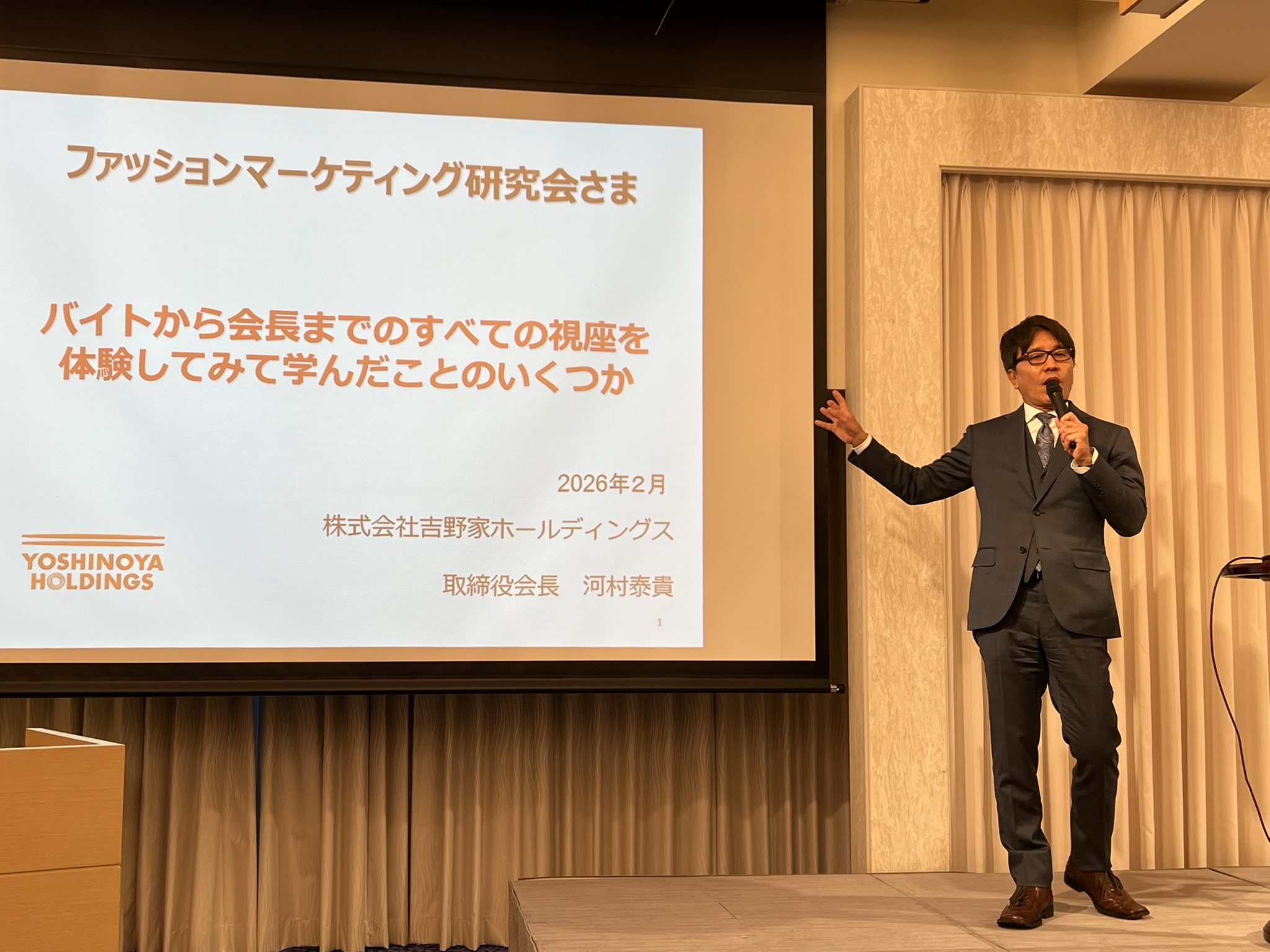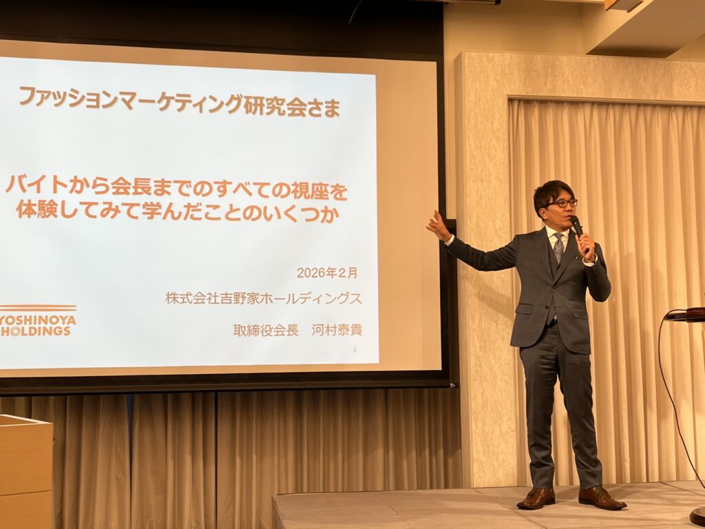 セミナーの講師は、昨年末にベストドレッサー賞(政治・経済部門)をご受賞いただきました、株式会社𠮷野家ホールディングス 取締役会長の河村泰貴様にお努めいただきました。また、聞き手は長年にわたり「ベスト・ファーザーブック」や「ベスト・ドレッサーブック」のプロデューサーをつと